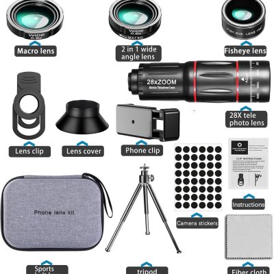 Phone Camera Lens Kit Upgraded Version Telephoto 28X Wide Angle 0.6X Macro 20X Fisheye 198° for Most Smartphones (Black)